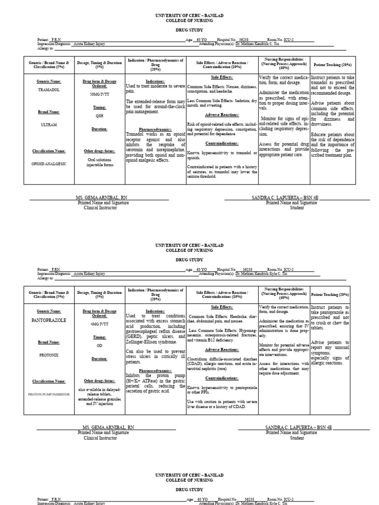 Impression/Diagnosis: Acute Kidney Injury Attending Physician(s): Dr. Mathieu Kendrick C. Tiu