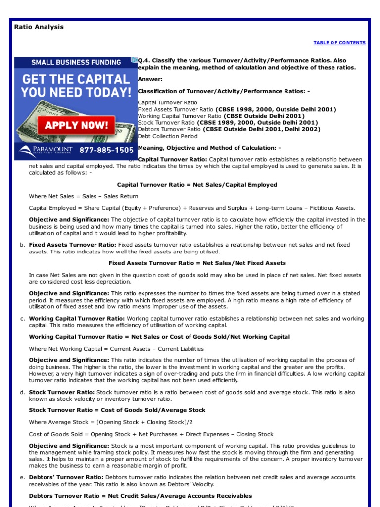 Q.4. Classify the various Turnover/Activity/Performance Ratios. Also explain the meaning, method of calculation and objective of these ratios. Answer: Classification of Turnover/Activity/Performance Ratios: a. b. c. d. e. f. Capital Turnover Ratio Fixed Assets Turnover Ratio (CBSE 1998, 2000, Outside Delhi 2001) Working Capital Turnover Ratio (CBSE Outside Delhi 2001) Stock Turnover Ratio (CBSE 1989, 2000, Outside Delhi 2001) Debtors Turnover Ratio (CBSE Outside Delhi 2001, Delhi 2002) Debt Collection Period Meaning, Objective and Method of Calculation: a. Capital Turnover Ratio: Capital turnover ratio establishes a relationship between net sales and capital employed. The ratio indicates the times by which the capital employed is used to generate sales. It is calculated as follows: Capital Turnover Ratio = Net Sales/Capital Employed Where Net Sales = Sales Sales Return Capital Employed = Share Capital (Equity + Preference) + Reserves and Surplus + Long-term Loans Fictitious Assets. Objective and Significance: The objective of capital turnover ratio is to calculate how efficiently the capital invested in the business is being used and how many times the capital is turned into sales. Higher the ratio, better the efficiency of utilisation of capital and it would lead to higher profitability. b. Fixed Assets Turnover Ratio: Fixed assets turnover ratio establishes a relationship between net sales and net fixed assets. This ratio indicates how well the fixed assets are being utilised. Fixed Assets Turnover Ratio = Net Sales/Net Fixed Assets In case Net Sales are not given in the question cost of goods sold may also be used in place of net sales. Net fixed assets are considered cost less depreciation. Objective and Significance: This ratio expresses the number to times the fixed assets are being turned over in a stated period. It measures the efficiency with which fixed assets are employed. A high ratio means a high rate of efficiency of utilisation of fixed asset and low ratio means improper use of the assets. c. Working Capital Turnover Ratio: Working capital turnover ratio establishes a relationship between net sales and working capital. This ratio measures the efficiency of utilisation of working capital. Working Capital Turnover Ratio = Net Sales or Cost of Goods Sold/Net Working Capital Where Net Working Capital = Current Assets Current Liabilities Objective and Significance: This ratio indicates the number of times the utilisation of working capital in the process of doing business. The higher is the ratio, the lower is the investment in working capital and the greater are the profits. However, a very high turnover indicates a sign of over-trading and puts the firm in financial difficulties. A low working capital turnover ratio indicates that the working capital has not been used efficiently. d. Stock Turnover Ratio: Stock turnover ratio is a ratio between cost of goods sold and average stock. This ratio is also known as stock velocity or inventory turnover ratio. Stock Turnover Ratio = Cost of Goods Sold/Average Stock Where Average Stock = [Opening Stock + Closing Stock]/2 Cost of Goods Sold = Opening Stock + Net Purchases + Direct Expenses Closing Stock Objective and Significance: Stock is a most important component of working capital. This ratio provides guidelines to the management while framing stock policy. It measures how fast the stock is moving through the firm and generating sales. It helps to maintain a proper amount of stock to fulfill the requirements of the concern. A proper inventory turnover makes the business to earn a reasonable margin of profit. e. Debtors Turnover Ratio: Debtors turnover ratio indicates the relation between net credit sales and average accounts receivables of the year. This ratio is also known as Debtors Velocity. Debtors Turnover Ratio = Net Credit Sales/Average Accounts Receivables Where Average Accounts Receivables = [Opening Debtors and B/R + Closing Debtors and B/R]/2