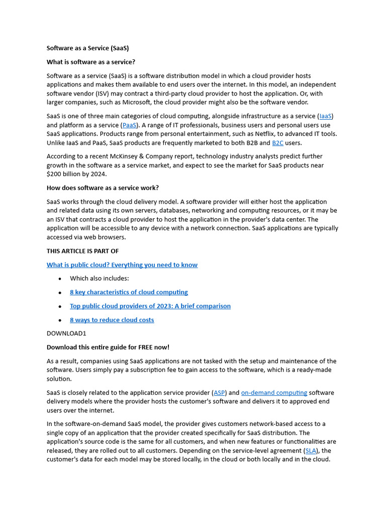 Software as a service (SaaS) is a software distribution model in which a cloud provider hosts