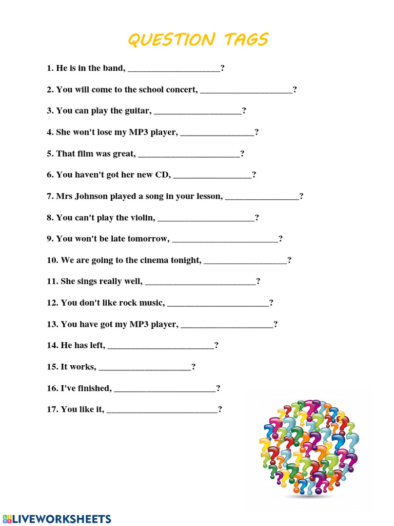This document contains a series of question tags to test knowledge of interrogative sentence structures in English. Each line presents a statement followed by a question tag to form a yes/no question, such as "You will come to the school concert, won't you?". There are 17 examples in total assessing usage of question tags with statements involving music, films, objects, activities, and plans.