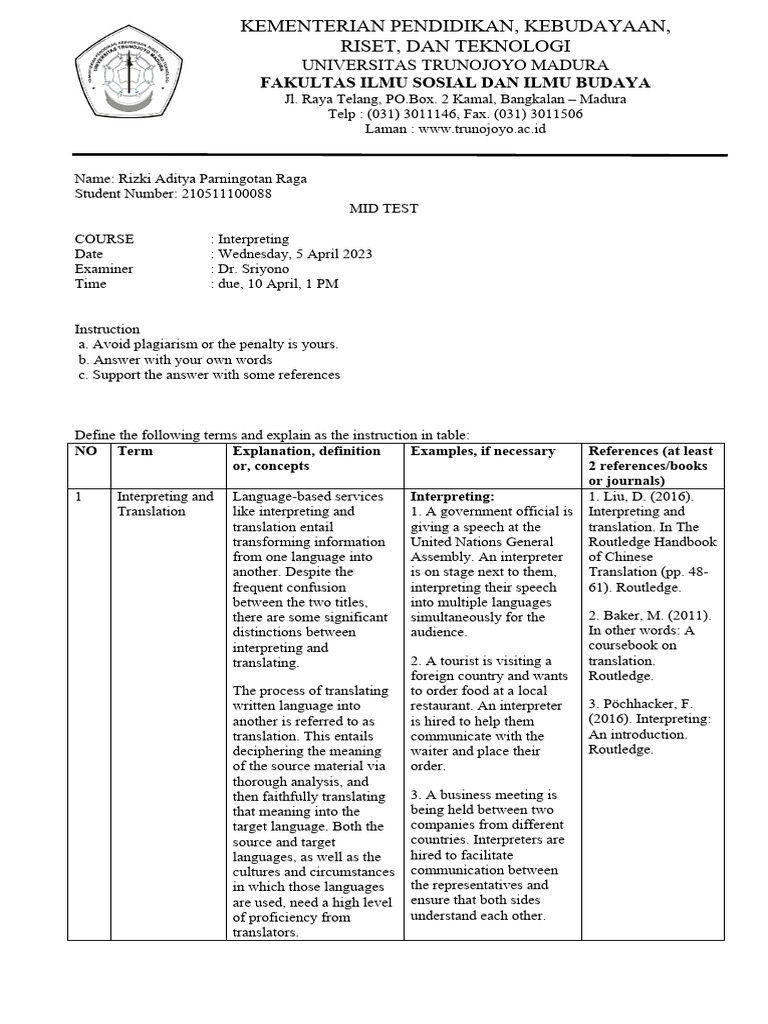 1      Interpreting and   Language-based services       Interpreting:                 1. Liu, D. (2016).