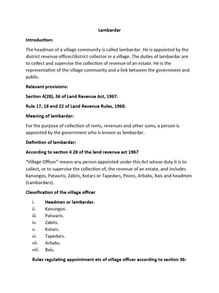 district revenue officer/district collector in a village. The duties of lambardar are