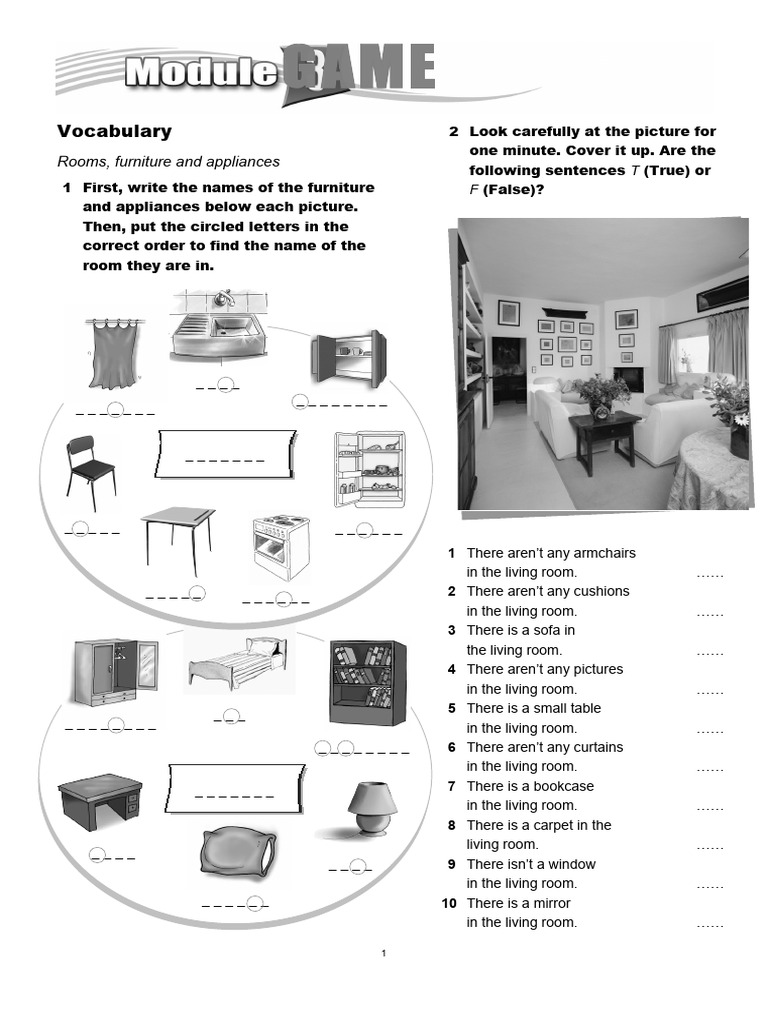 (see example below) and 3 topic cards (e.g. Rooms/Furniture/Appliances).