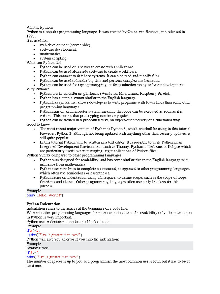 Python is a popular programming language. It was created by Guido van Rossum, and released in