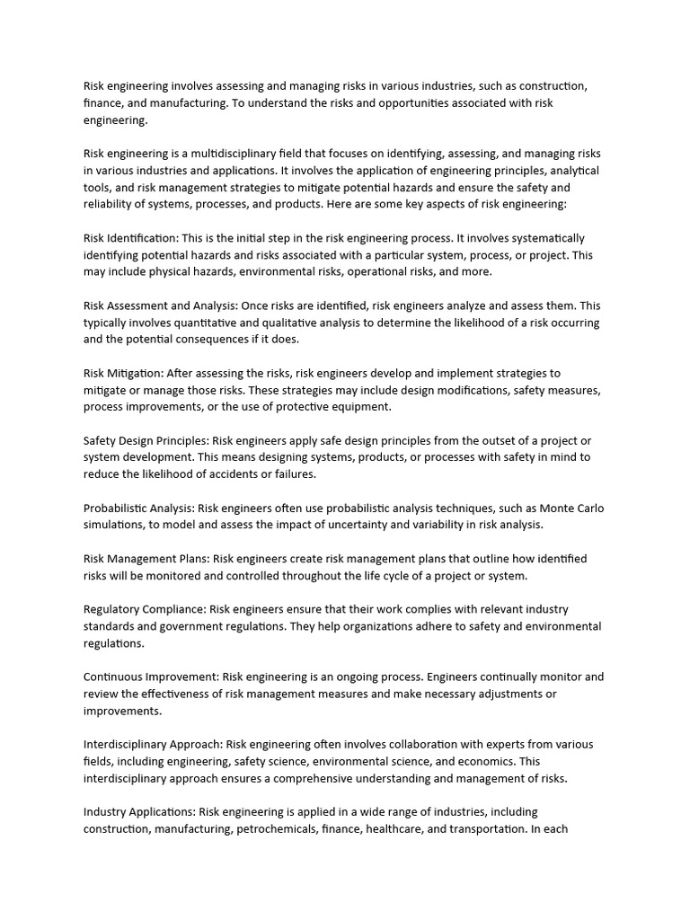reliability of systems, processes, and products. Here are some key aspects of risk engineering: