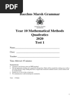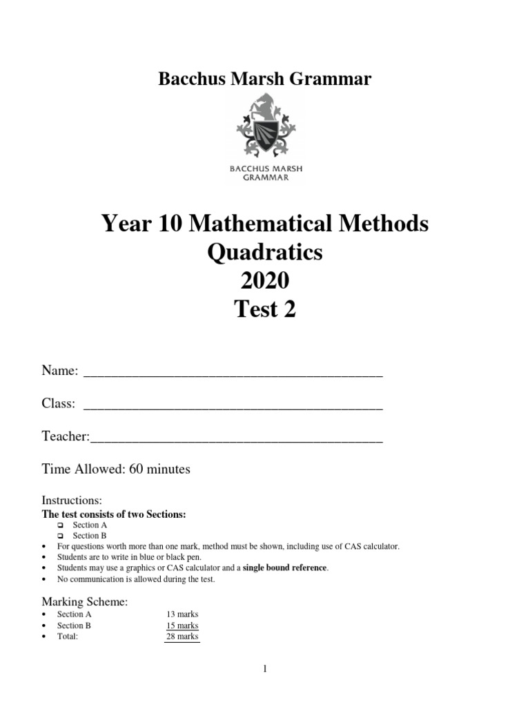 YEAR and CLASS: Year 10 Mathematical Methods – Quadratics, Test 2, 2020