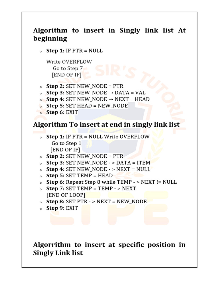 Algorithm to insert in Singly link list At