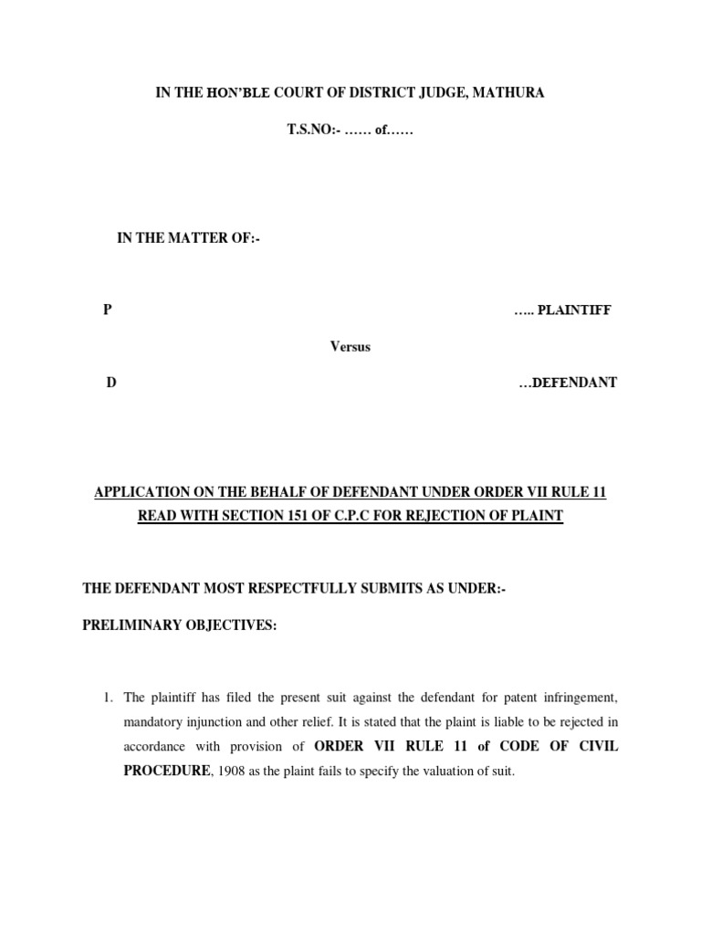 APPLICATION ON THE BEHALF OF DEFENDANT UNDER ORDER VII RULE 11
