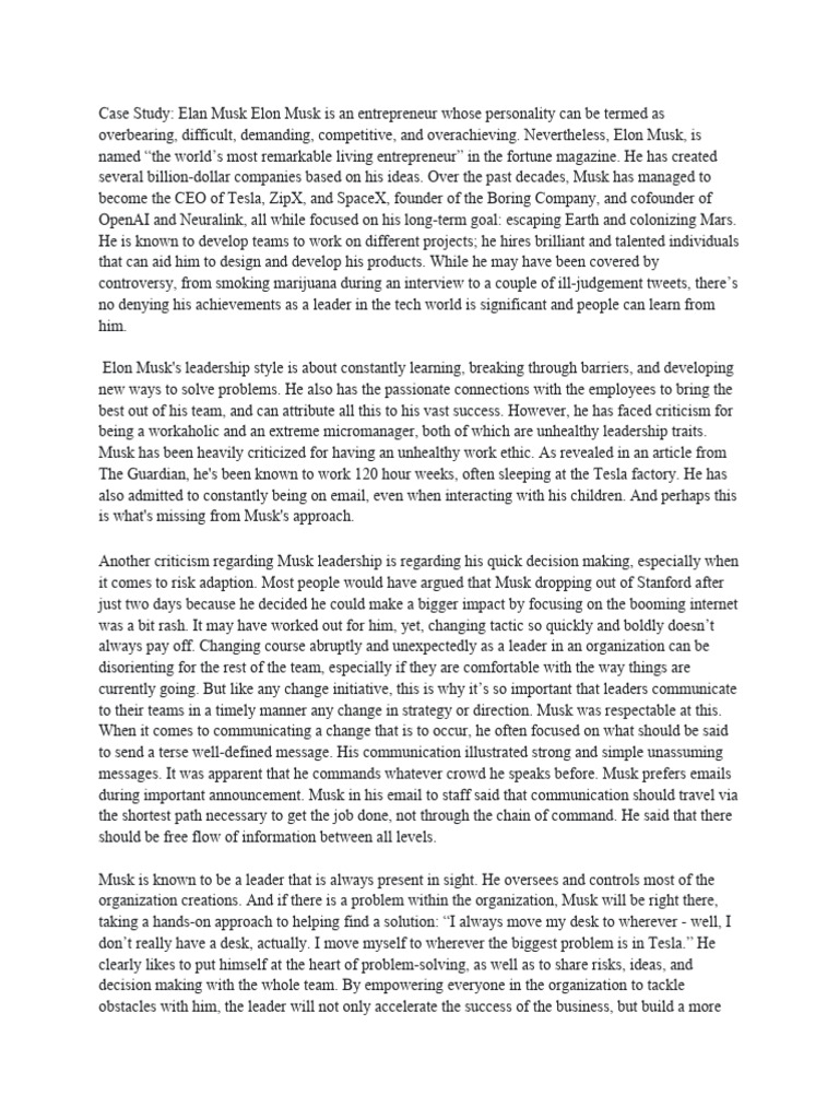Case Study: Elan Musk Elon Musk is an entrepreneur whose personality can be termed as