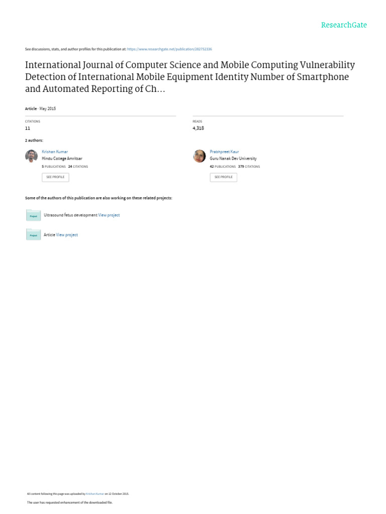 [4]MayankSahni,“DETECTING AND AUTOMATED REPORTING OF CHANGE IN IMEI NUMBER”,