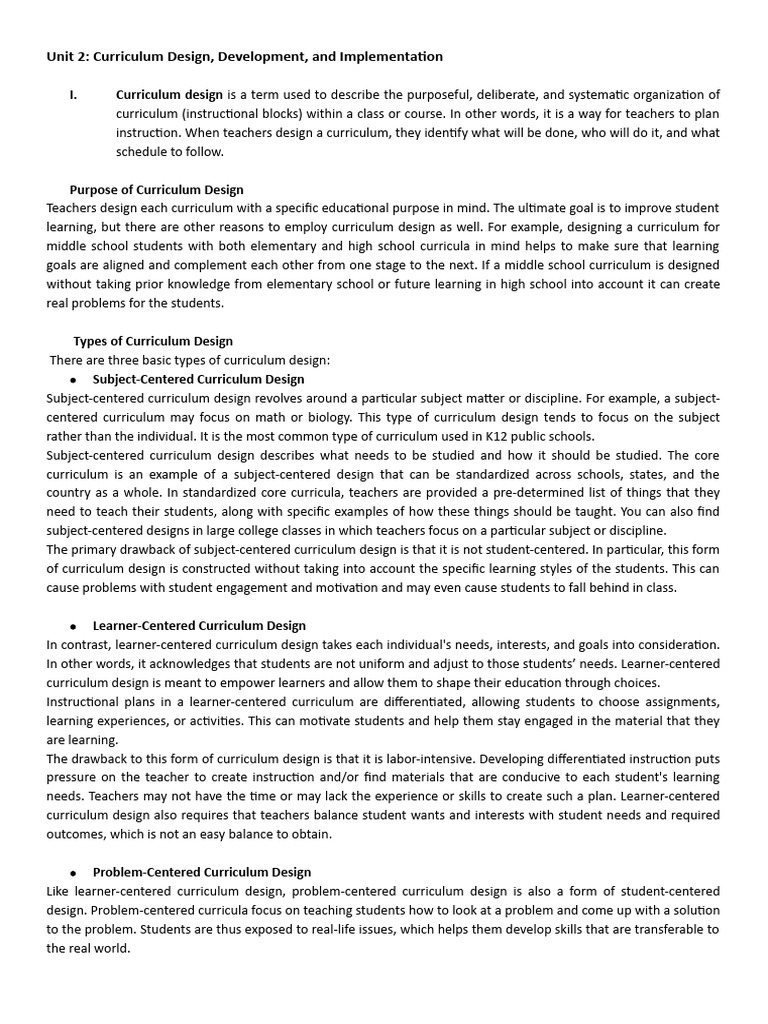 Unit 2: Curriculum Design, Development, and Implementation