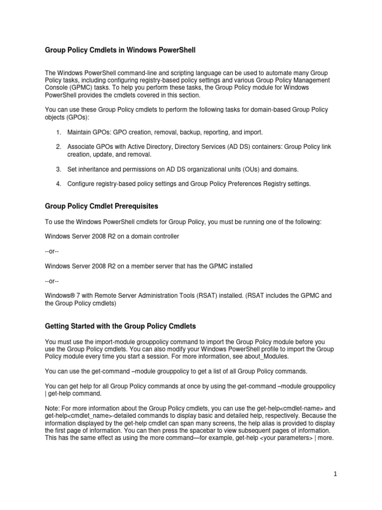 Note: For more information about the Group Policy cmdlets, you can use the get-help<cmdlet-name> and