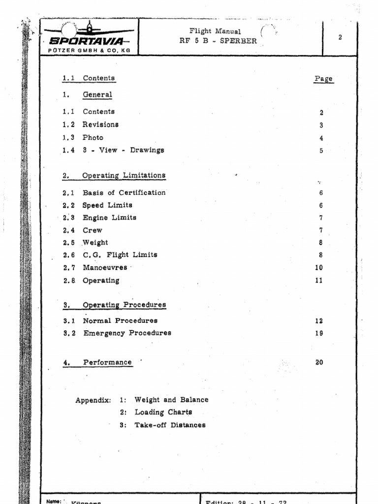 Flight Manual is certified on the basis of: a) Requirements for Approval and Certification of Powered (LBA - Mitteilung 10.05, edition January 8,.1959 incl, amendments of May 25, 1966 and August 7, 1967) '.' Category' Normal Powered Glider, Self launching Aerobatics and Cloud Flying not allowed, kmjh 225 _ speed speed speed extended operating retracted 165 NE never max. Max. Stalling exceed