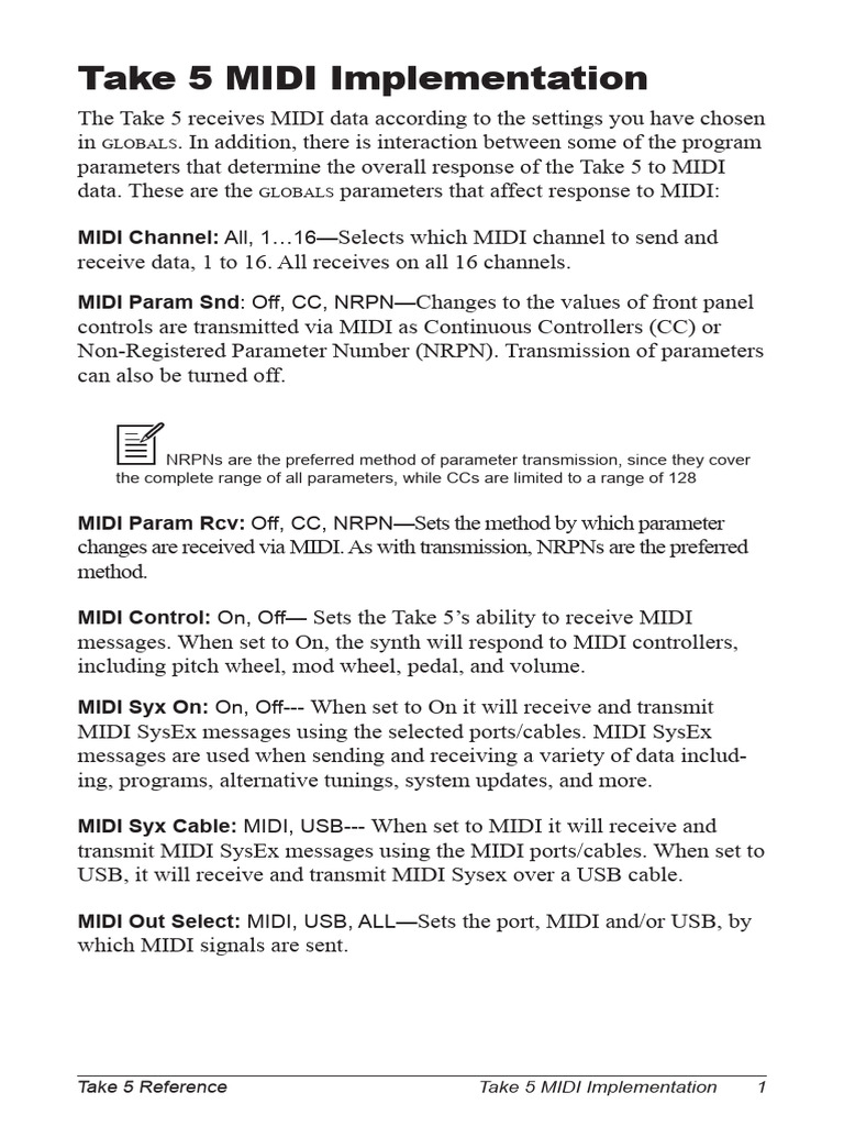 mapped to Take 5 controls. They are transmitted when Param Xmit is set to CC,