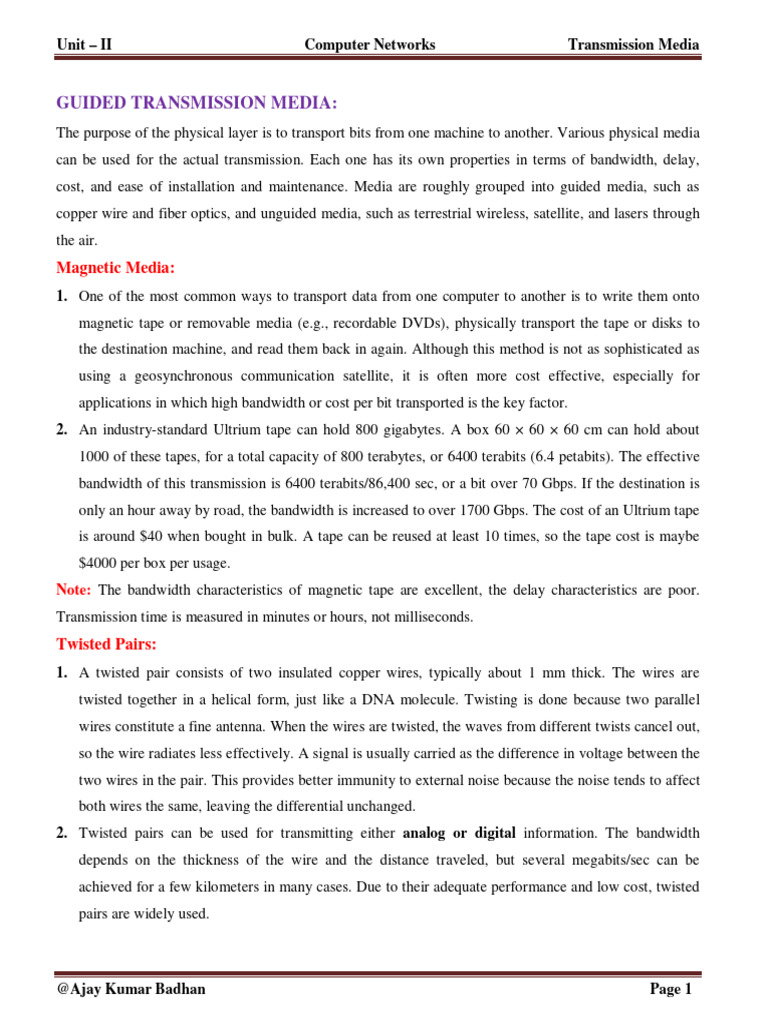 The bandwidth is a physical property of the transmission medium that depends on the construction,
