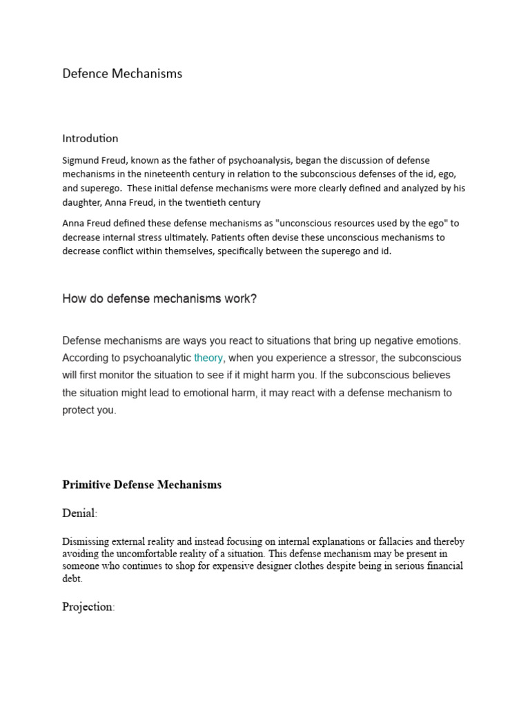 and superego. These initial defense mechanisms were more clearly defined and analyzed by his