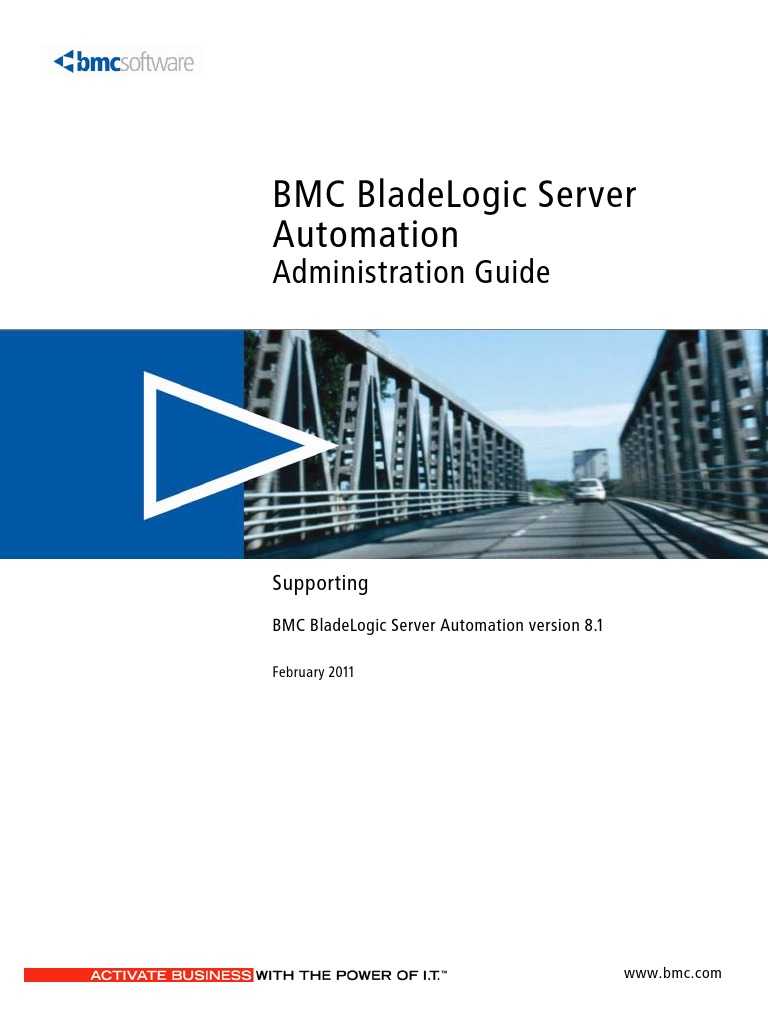 The BMC BladeLogic Server Automation Administration Guide describes all of the configuration and administration tasks you can perform to ensure the smooth functioning of BMC BladeLogic Server Automation (referred to in this guide as BMC BladeLogic). This document describes how to set up and maintain an Application Server, how to implement security restrictions, and how to define user permissions using the BMC BladeLogic configuration files.