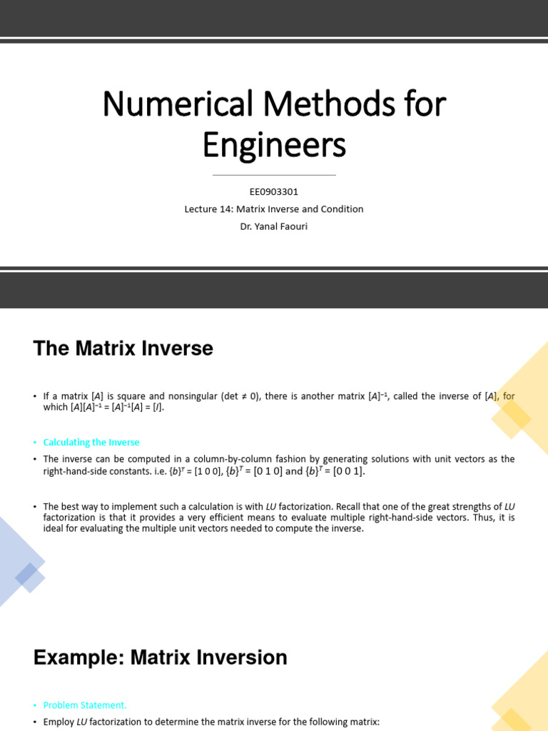 • There are a variety of ways to solve Eq. [A]{x} = {b}. One of these methods is by using the matrix inverse. The