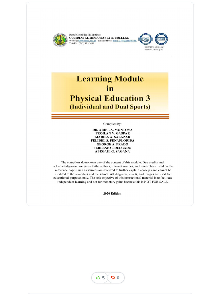 Tulio et al., (2005). PE 3 Individual and Dual Sports. Katha Publishing