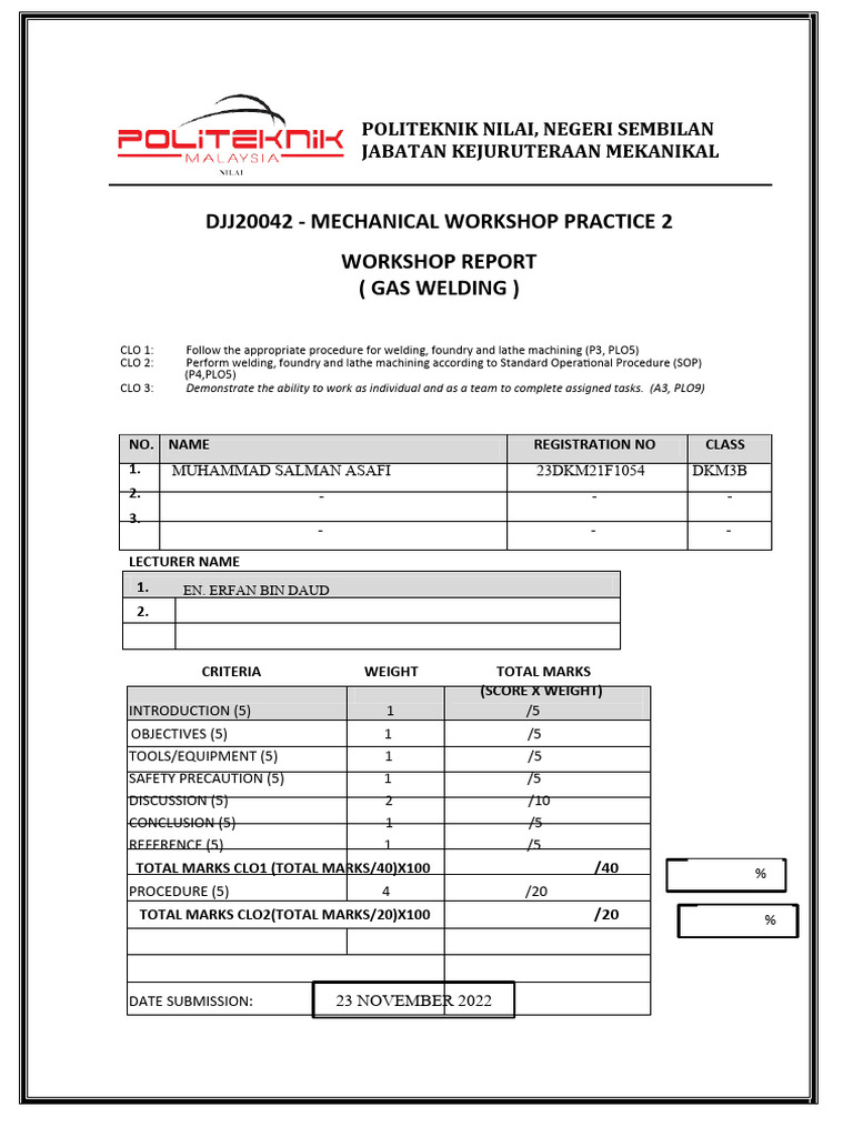 CLO 2: Perform welding, foundry and lathe machining according to Standard Operational Procedure (SOP) (P4, PLO5)
