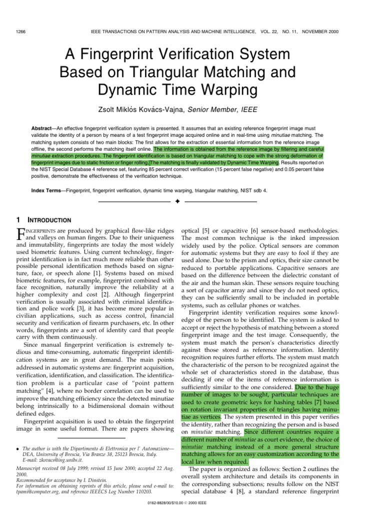 minutiae extraction procedures. The fingerprint identification is based on triangular matching to cope with the strong deformation of