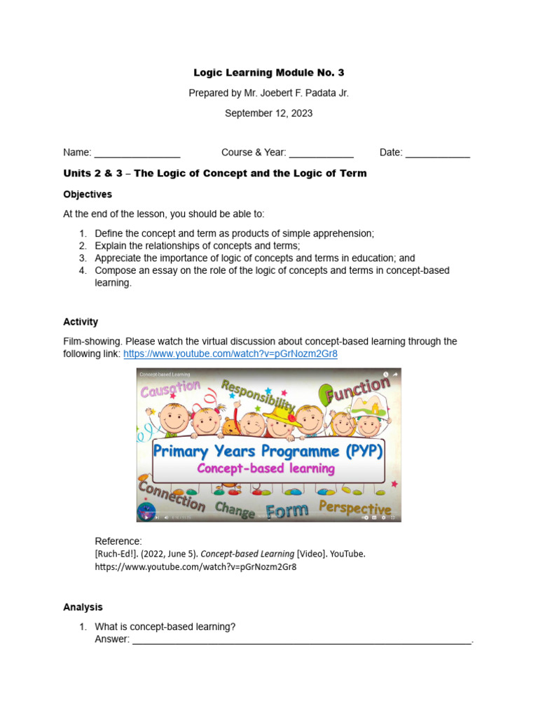 3. Appreciate the importance of logic of concepts and terms in education; and