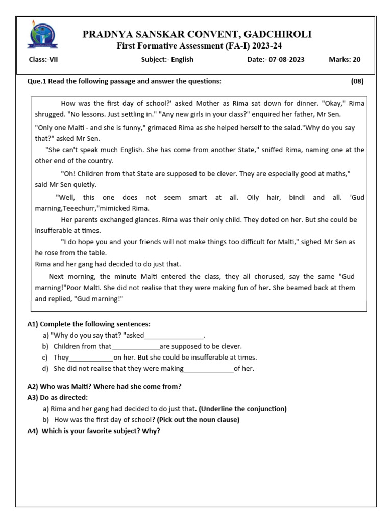 Class:-VII Subject:- English Date:- 07-08-2023 Marks: 20