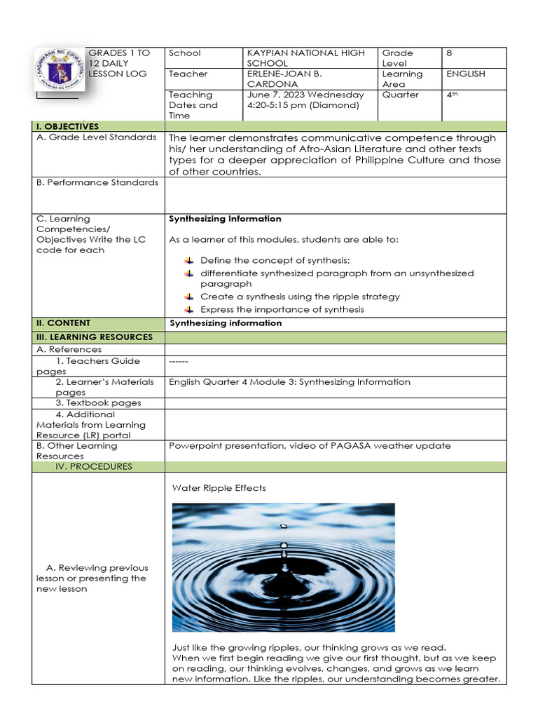 LESSON LOG Teacher ERLENE-JOAN B. Learning ENGLISH