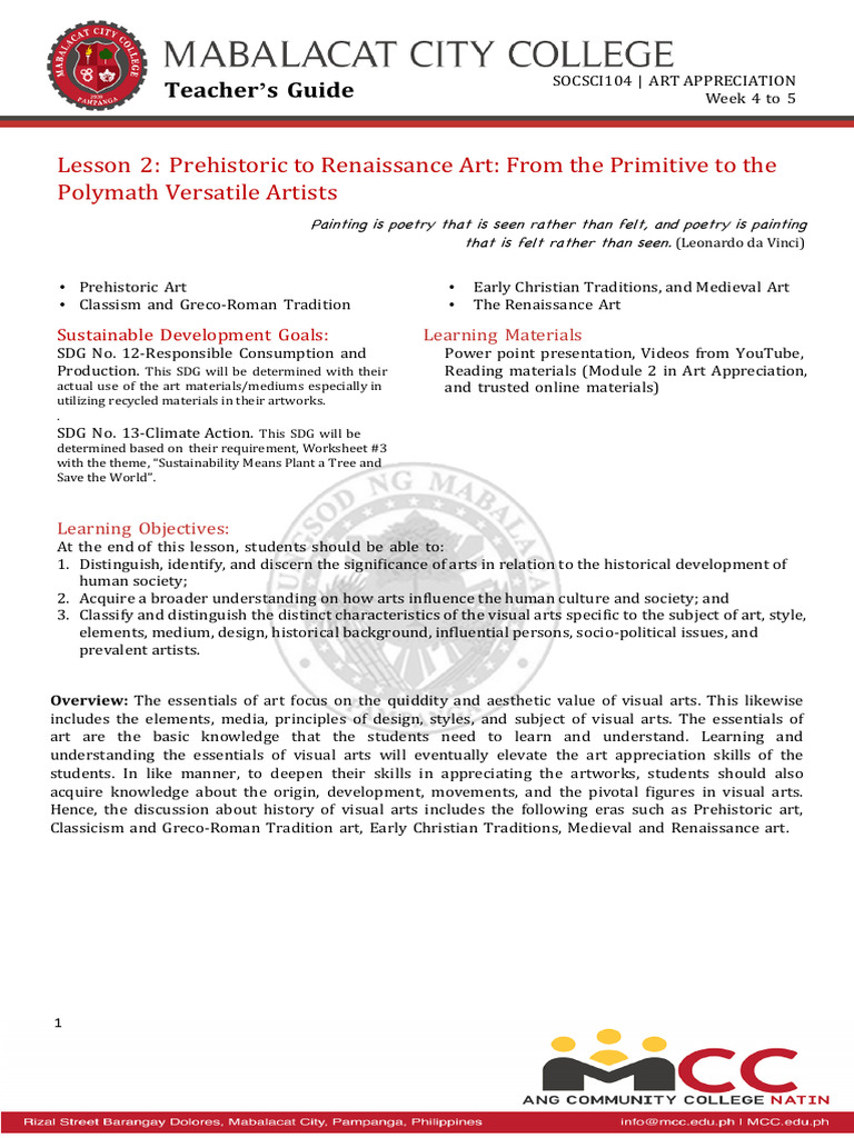 Lesson 2: Prehistoric to Renaissance Art: From the Primitive to the