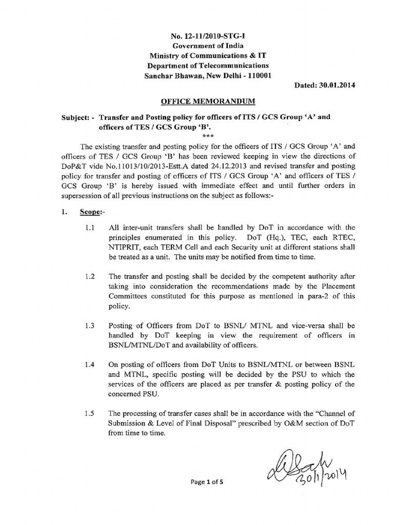 1.3 Posting of Officers from DoT to BSNL/ MTNL and vice-versa shall be