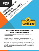 Daily Weekly Clean up Web browser files Delete cookies. Delete cache. Delete history files. Empty the Recycle Bin This, and other cleanup tasks, can be performed with the Disk Cleanup program. (See Running the Disk Cleanup Program on page 2.) Back up important files to CD or DVD (See Creating Data Backup Discs on page 1.) Monthly Clean up the desktop Delete or uninstall unneeded icons and applications. (See Removing Unused Programs on page 1.) Maintain overall condition Check cleanliness. Make sure ventilation is unobstructed. Secure all connections and cabling. Create a Restore Point (See Microsoft System Restore on page 23.) Quarterly (seasonally)