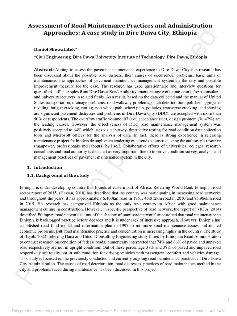 This study is focused on the previously conducted and currently ongoing road maintenance practices in Dire Dawa