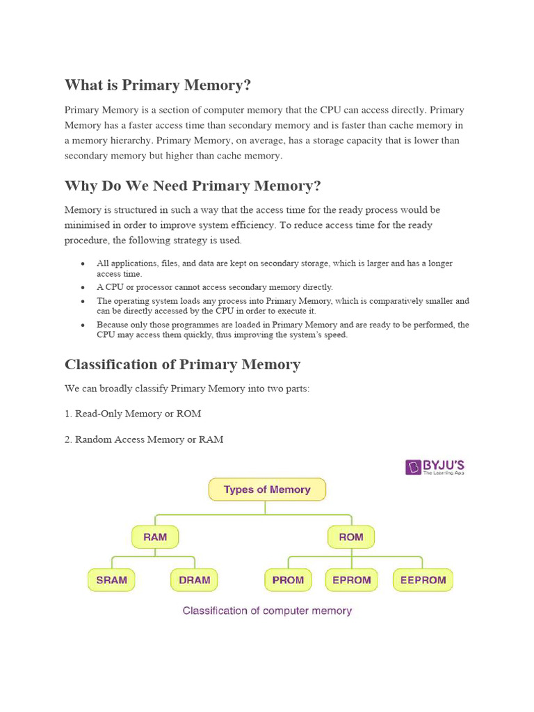 Primary Memory is a section of computer memory that the CPU can access directly. Primary