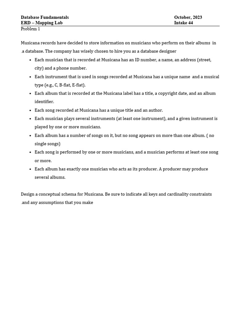 • Each musician that is recorded at Musicana has an ID number, a name, an address (street,