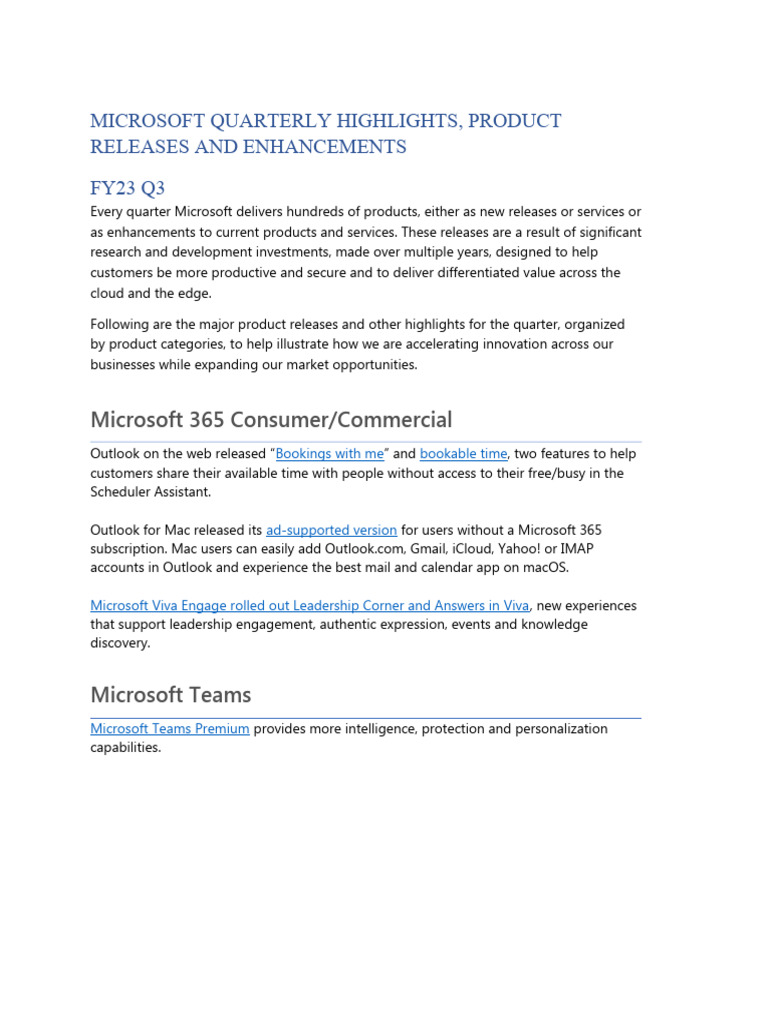 MICROSOFT QUARTERLY HIGHLIGHTS, PRODUCT