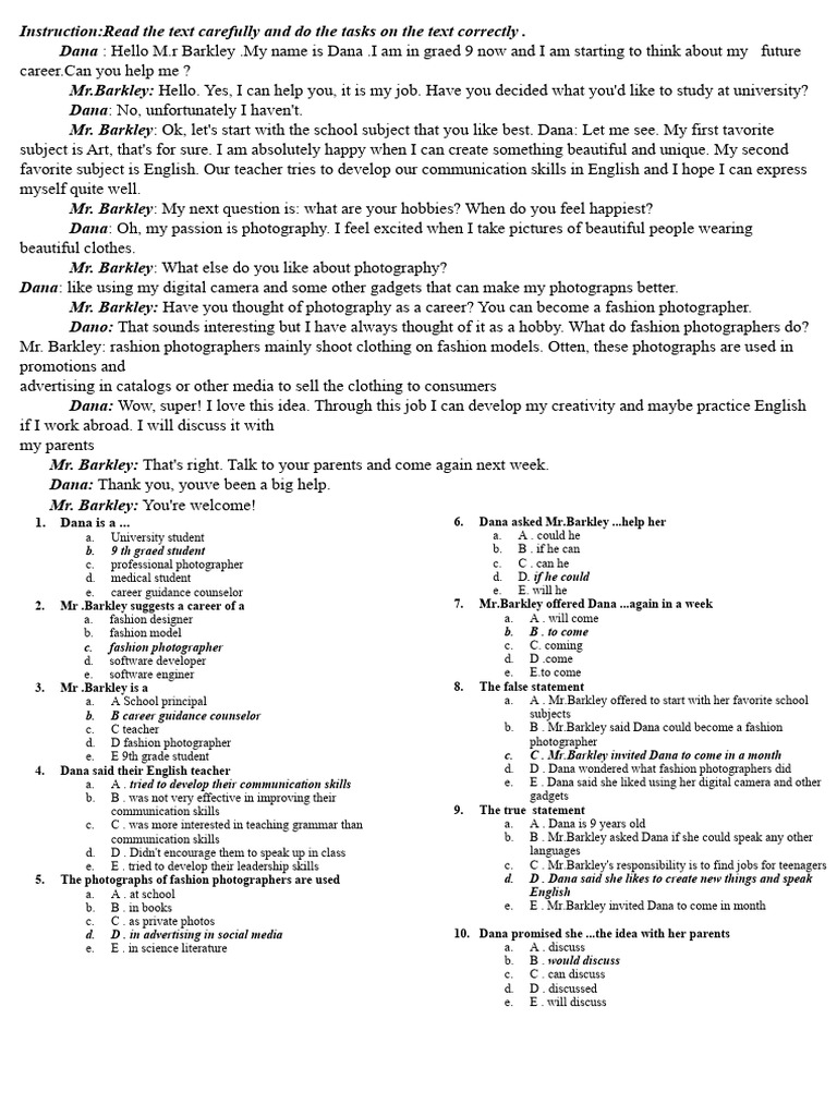 e. E 9th grade student c. C . Mr.Barkley invited Dana to come in a month