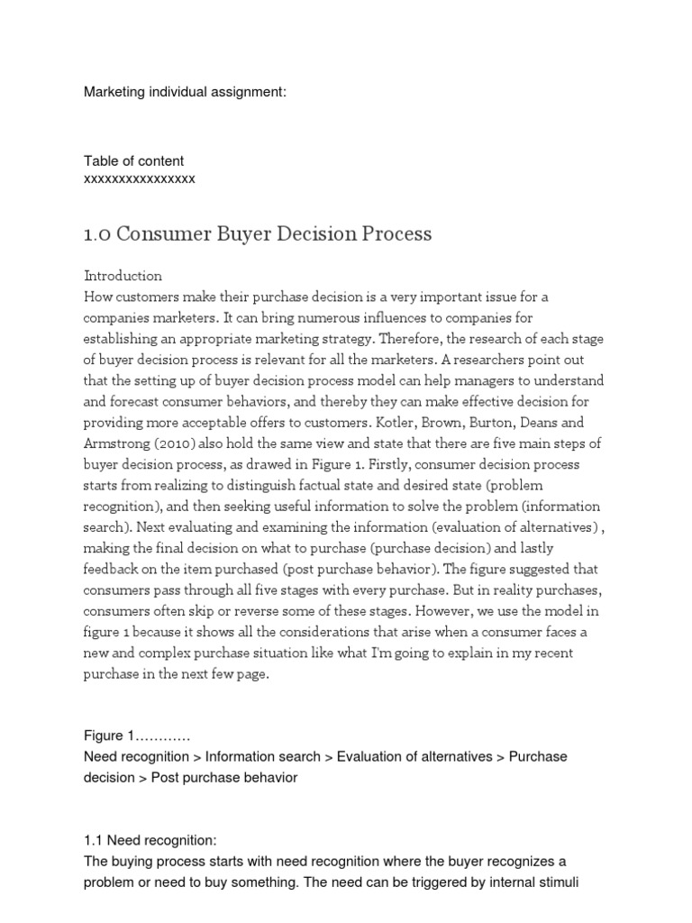 Introduction How customers make their purchase decision is a very important issue for a companies marketers. It can bring numerous influences to companies for establishing an appropriate marketing strategy. Therefore, the research of each stage of buyer decision process is relevant for all the marketers. A researchers point out that the setting up of buyer decision process model can help managers to understand and forecast consumer behaviors, and thereby they can make effective decision for providing more acceptable offers to customers. Kotler, Brown, Burton, Deans and Armstrong (2010) also hold the same view and state that there are five main steps of buyer decision process, as drawed in Figure 1. Firstly, consumer decision process starts from realizing to distinguish factual state and desired state (problem recognition), and then seeking useful information to solve the problem (information search). Next evaluating and examining the information (evaluation of alternatives) , making the final decision on what to purchase (purchase decision) and lastly feedback on the item purchased (post purchase behavior). The figure suggested that consumers pass through all five stages with every purchase. But in reality purchases, consumers often skip or reverse some of these stages. However, we use the model in figure 1 because it shows all the considerations that arise when a consumer faces a new and complex purchase situation like what I'm going to explain in my recent purchase in the next few page.