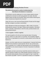 car are reduced. The second factor is unexpected situational factors. The consumer may form a purchase intention based on factors such as expected income i get, expected price offered, and expected benefits. However, unexpected events may change the purchase intention. For example, the economy might take a turn for worse, a close competitor might drop it's price, or a friend of mine might report being disappointed in my preferred car. In short, preferences and even purchase intentions do not always result in actual purchase choice. 1.5 Post purchase Behavior After purchasing a product, the consumer will be satisfied or dissatisfied and will engage in post purchase behavior of interest to the marketers. What determines whether the buyer is satisfied or dissatisfied with a purchase is the relationship that lies between the consumer's expectations and the product perceived performance. If the product falls short of expectations, the consumer is disappointed. While if it meets expectations, the consumer is satisfied and if it exceeds expectations, the consumer is delighted. The larger the gap between expectations and performance, the greater the consumer's dissatisfaction. Almost all major purchases result in cognitive dissonance, or discomfort caused by post purchase conflict. That is why it is important to satisfy the customer because it is the key to building a profitable relationships with customer .