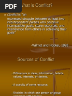 may ever occur. Much unnecessary conflict could be prevented or reduced if managers examined the organization more closely for antecedent conditions. 2. Perceived/ Substantive Is intellectualized and often involves issues and roles. The person recognizes it logically and impersonally as occurring. Sometimes, conflict can be resolved at this stage before it is internalized or felt. 3. Felt Occurs when conflict is emotionalized. Felt emotions include hostility, fear, mistrust, and anger. Also referred to as Affective Conflict. It is possible to perceive conflict and not feel it. A person can also feel the conflict but not perceive the problem. 4. Manifest Also called Overt Conflict. In this stage, action is taken. It may be to withdraw, compete, debate, or seek conflict resolution. 5. Conflict aftermath It is the end result of conflict. It is always present and is either positive or negative. 4. Familiarize with the common Conflict Resolution strategies. Compromising 6 mins. Each party gives up something it wants. End result: Lose-Lose situation Competing It is used when one party pursues what it wants at the expense of the others. Because only one party wins, competing party seeks to win regardless of the cost to others. Managers may use this when a quick or unpopular decision needs to be made. Its also appropriately used when one party has more information or knowledge about a situation than the others. Competing in the form of resistance is also appropriate when an individual needs to resist unsafe