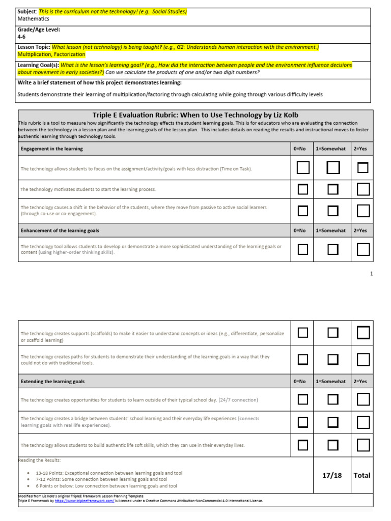 Modified from Liz Kolb’s original TripleE Framework Lesson Planning Template