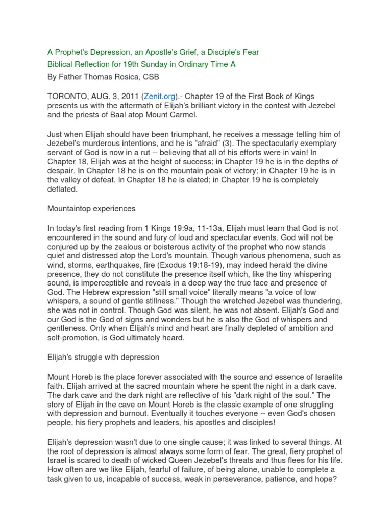 Rosica, CSB TORONTO, AUG. 3, 2011 (Zenit.org).- Chapter 19 of the First Book of Kings presents us with the aftermath of Elijah's brilliant victory in the contest with Jezebel and the priests of Baal atop Mount Carmel. Just when Elijah should have been triumphant, he receives a message telling him of Jezebel's murderous intentions, and he is "afraid" (3). The spectacularly exemplary servant of God is now in a rut -- believing that all of his efforts were in vain! In Chapter 18, Elijah was at the height of success; in Chapter 19 he is in the depths of despair. In Chapter 18 he is on the mountain peak of victory; in Chapter 19 he is in the valley of defeat. In Chapter 18 he is elated; in Chapter 19 he is completely deflated. Mountaintop experiences In today's first reading from 1 Kings 19:9a, 11-13a, Elijah must learn that God is not encountered in the sound and fury of loud and spectacular events. God will not be conjured up by the zealous or boisterous activity of the prophet who now stands quiet and distressed atop the Lord's mountain. Though various phenomena, such as wind, storms, earthquakes, fire (Exodus 19:18-19), may indeed herald the divine presence, they do not constitute the presence itself which, like the tiny whispering sound, is imperceptible and reveals in a deep way the true face and presence of God. The Hebrew expression "still small voice" literally means "a voice of low whispers, a sound of gentle stillness." Though the wretched Jezebel was thundering, she was not in control. Though God was silent, he was not absent. Elijah's God and our God is the God of signs and wonders but he is also the God of whispers and gentleness. Only when Elijah's mind and heart are finally depleted of ambition and self-promotion, is God ultimately heard. Elijah's struggle with depression Mount Horeb is the place forever associated with the source and essence of Israelite faith. Elijah arrived at the sacred mountain where he spent the night in a dark cave. The dark cave and the dark night are reflective of his "dark night of the soul." The story of Elijah in the cave on Mount Horeb is the classic example of one struggling with depression and burnout. Eventually it touches everyone -- even God's chosen people, his fiery prophets and leaders, his apostles and disciples! Elijah's depression wasn't due to one single cause; it was linked to several things. At the root of depression is almost always some form of fear. The great, fiery prophet of Israel is scared to death of wicked Queen Jezebel's threats and thus flees for his life. How often are we like Elijah, fearful of failure, of being alone, unable to complete a task given to us, incapable of success, weak in perseverance, patience, and hope?