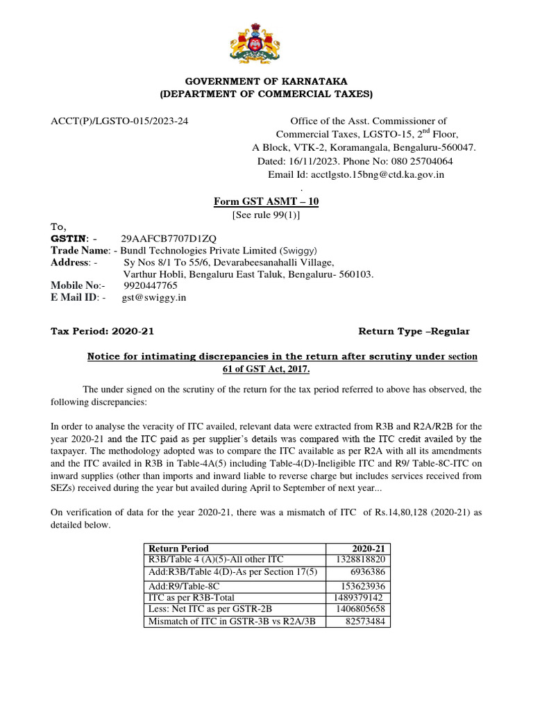 year 2020-21 and the ITC paid as per supplier’s details was compared with the ITC credit availed by the