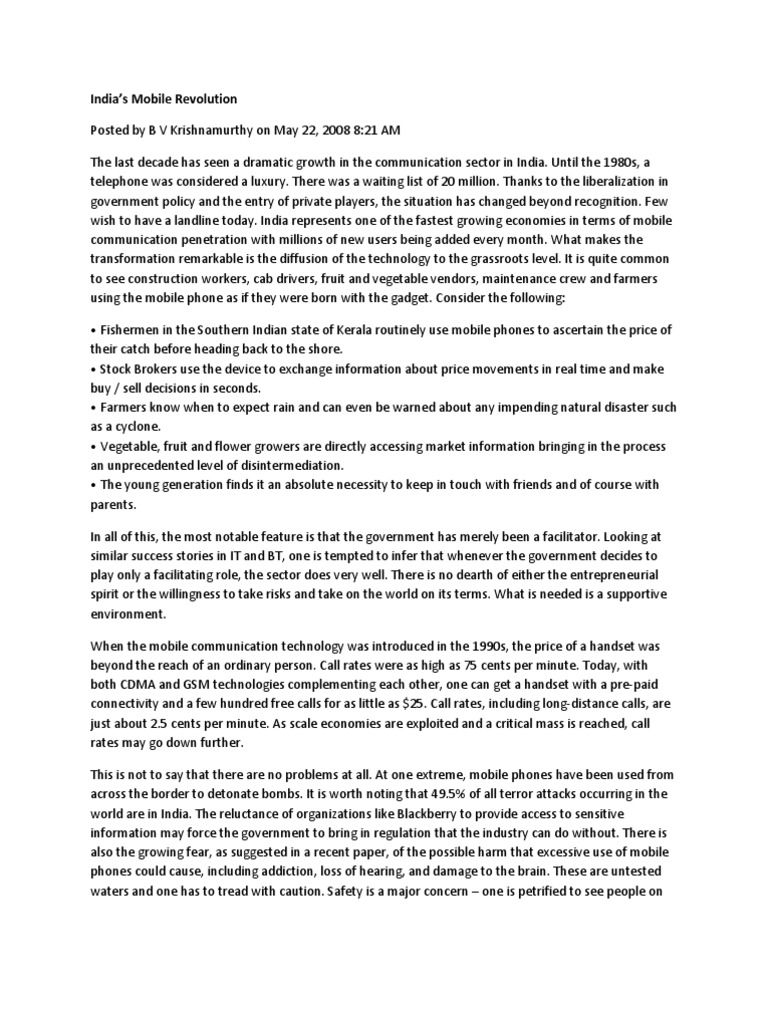 motorcycles and scooters using a mobile phone while driving. Students using the device to send SMS even from classrooms is another area that needs to be addressed. Service providers would do well to bring in some form of self-regulation one provider promises 40,000 ringtones and downloads: is this necessary? Cooperation among competitors is also critical some resources such as relay towers need to be shared; there is just no space for every service provider to have a tower in every location and moreover such an approach may lead to unnecessary investments and increased costs. Communication, like any technology, is a double-edged sword. Used with due diligence, it can improve the quality of life through enhanced productivity and efficiency. In the wrong hands, it can also cause destruction. The choice is ours. The number of mobile phones is expected to touch the 500 million mark in two years. That is good news for manufacturers, service providers, and customers. Even as the country prepares to embrace the next wave of technology, let us learn from the experience of other countries, and avoid the pitfalls that might confront us in the relentless pursuit of progress. *** Sign up for the Harvard Business Publishing Weekly Hotlist, a new weekly email roundup featuring the top highlights from HarvardBusiness.org.