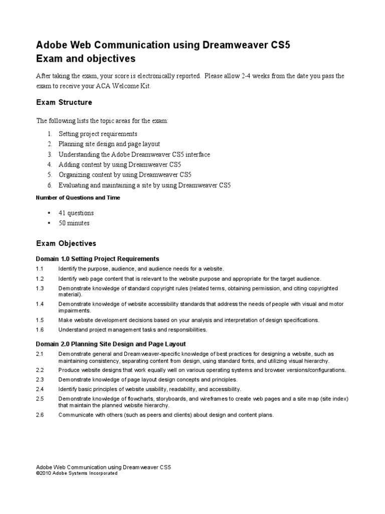 The following lists the topic areas for the exam: 1. Setting project requirements 2. Planning site design and page layout 3. Understanding the Adobe Dreamweaver CS5 interface 4. Adding content by using Dreamweaver CS5 5. Organizing content by using Dreamweaver CS5 6. Evaluating and maintaining a site by using Dreamweaver CS5