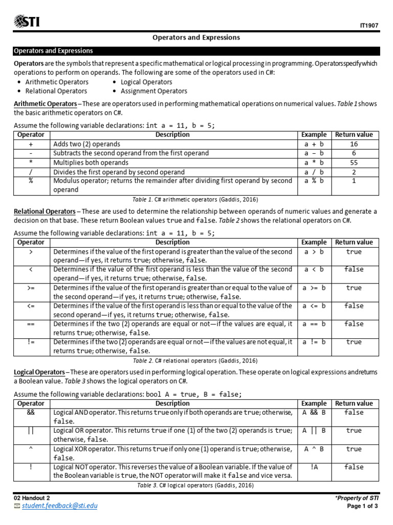 Table 1. C# arithmetic operators (Gaddis, 2016)