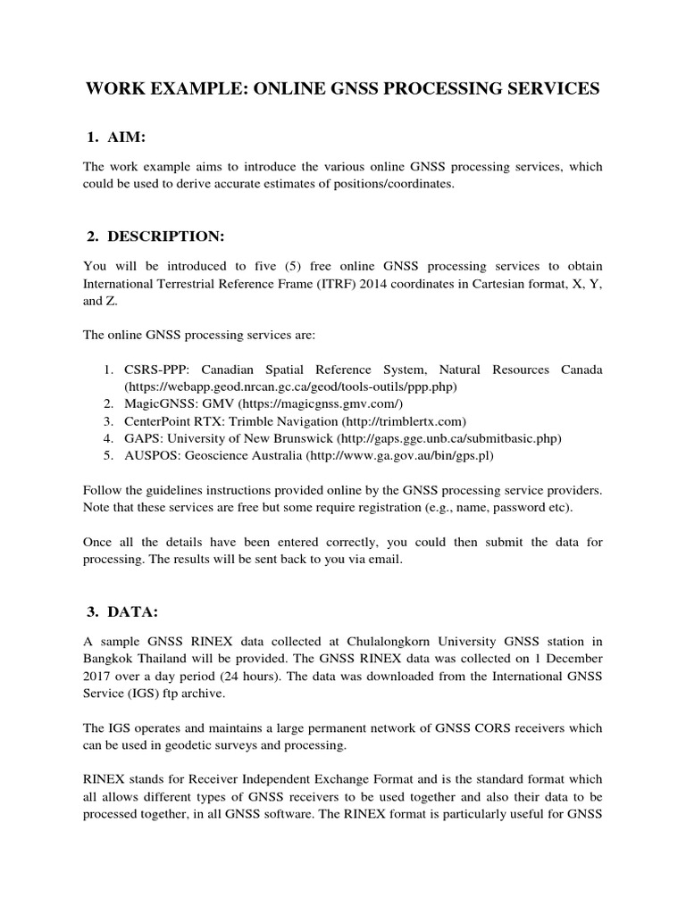 The work example aims to introduce the various online GNSS processing services, which