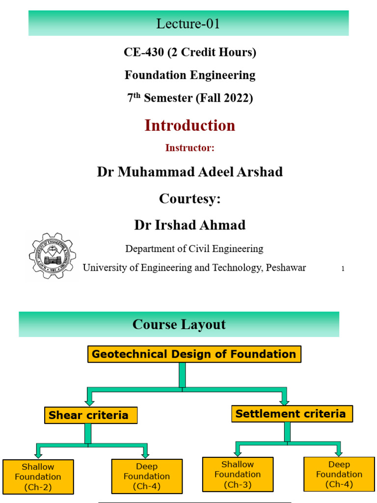 Introduction to course, Definition, Purpose and types of foundations, General requirement of