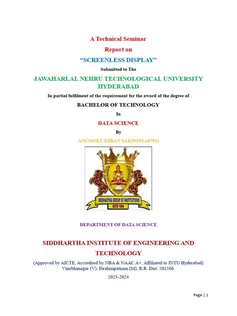 This is to certify that the Technical seminar entitled “SCREENLESS DISPLAY” is being