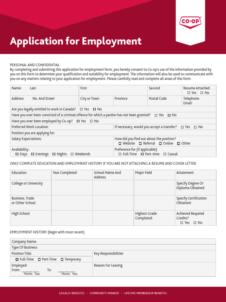 By completing and submitting this application for employment form, you hereby consent to Co-op’s use of the information provided by
