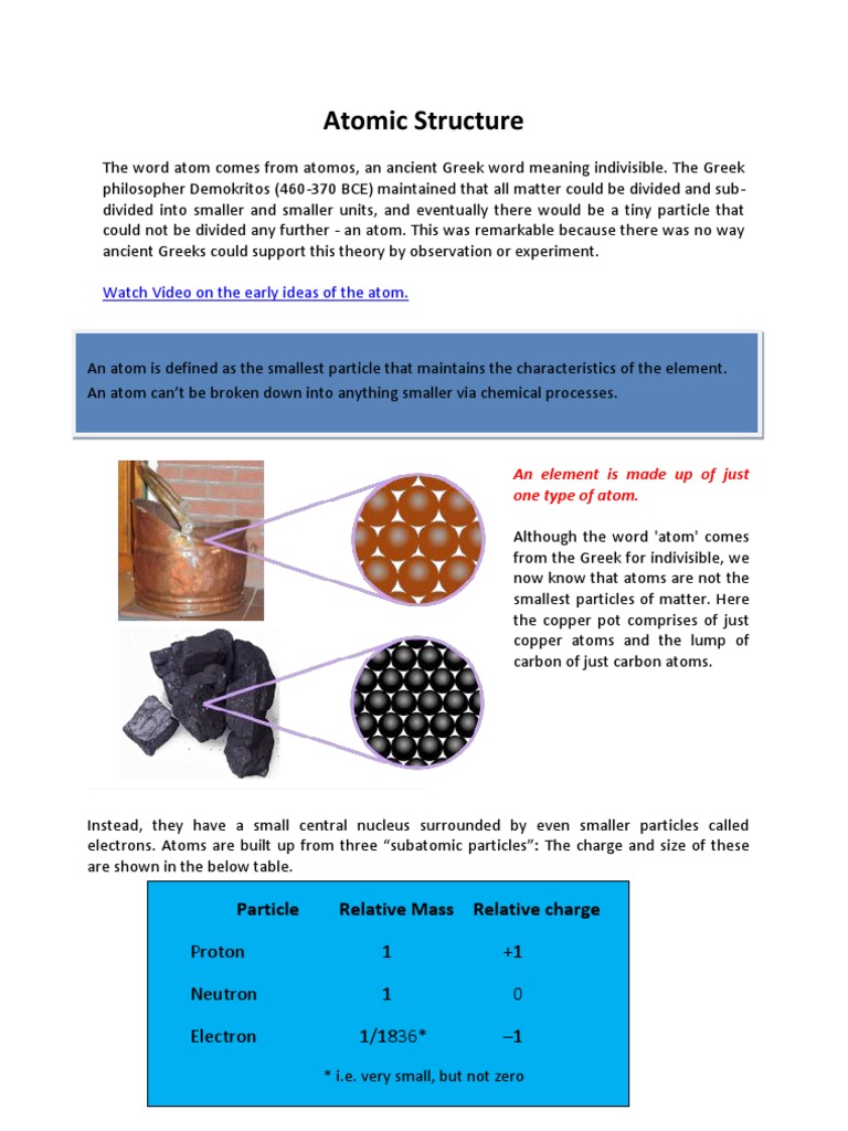 Instead, they have a small central nucleus surrounded by even smaller particles called electrons. Atoms are built up from three subatomic particles: The charge and size of these are shown in the below table.
